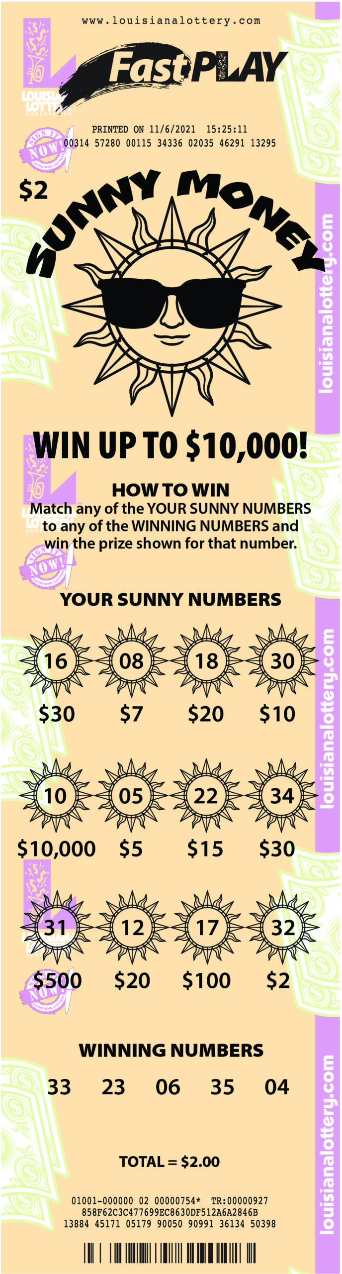 Match any of the YOUR SUNNY NUMBERS to any of the WINNING NUMBERS and win the prize shown for that number.