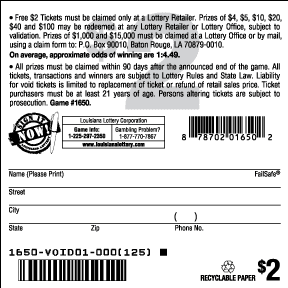 Every effort has been made to ensure that the preceding list of prize payouts, odds, and other game information provided on this page is correct. However, in the event of an error, the official files of the Louisiana Lottery shall be controlling. |
