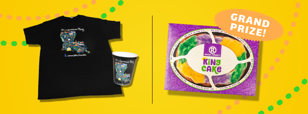 Get in the Mardi Gras spirit with exciting Lottery games, a social media giveaway, and in-store prize-with-purchase events. Play Mardi Gras-themed scratch-offs and Fast Play games, join the Great King Cake Debate Giveaway on Facebook, and celebrate Carnival season all across Louisiana!